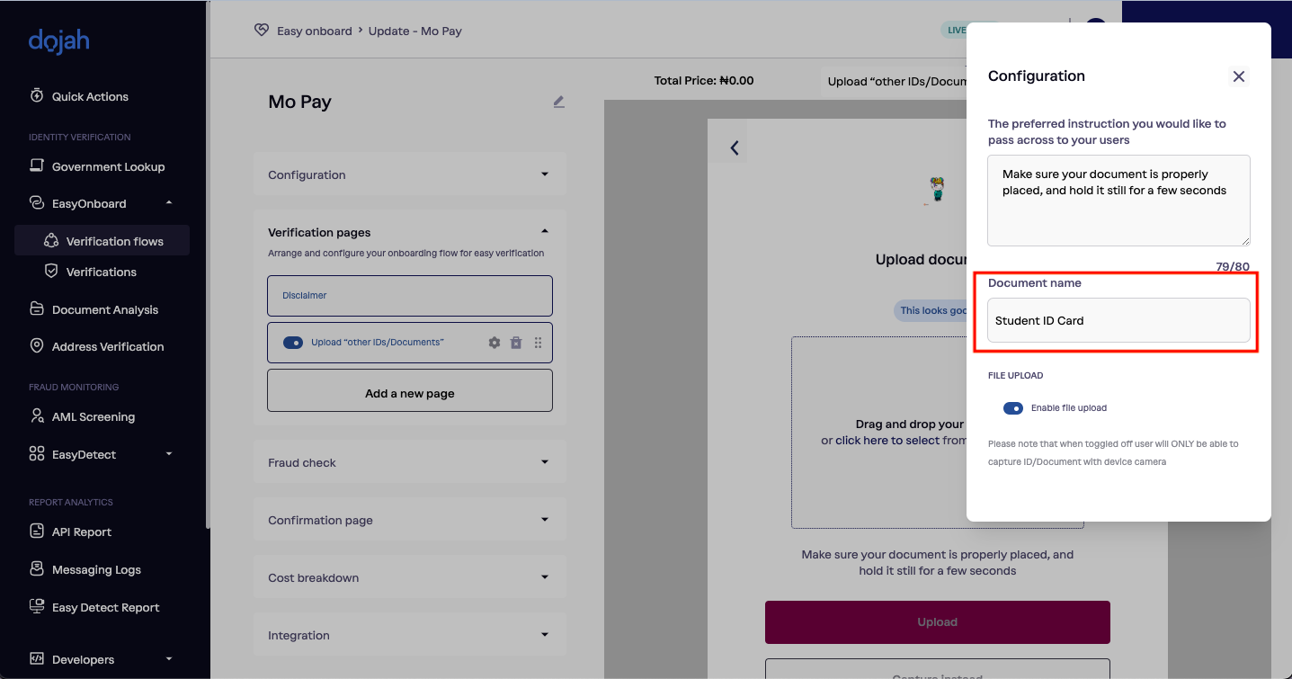 <figure><img src="https://3296995301-files.gitbook.io/~/files/v0/b/gitbook-x-prod.appspot.com/o/spaces%2F2pgHlRJB7EejHn55UcwX%2Fuploads%2FG5lLWsKBmopz7mDdglGa%2FScreenshot%202024-06-04%20at%2010.44.00.png?alt=media&#x26;token=4334ee59-33db-46e8-bf99-ffef0b1095e9" alt=""><figcaption><p>Configure page by naming the document that can be uploaded</p></figcaption></figure>