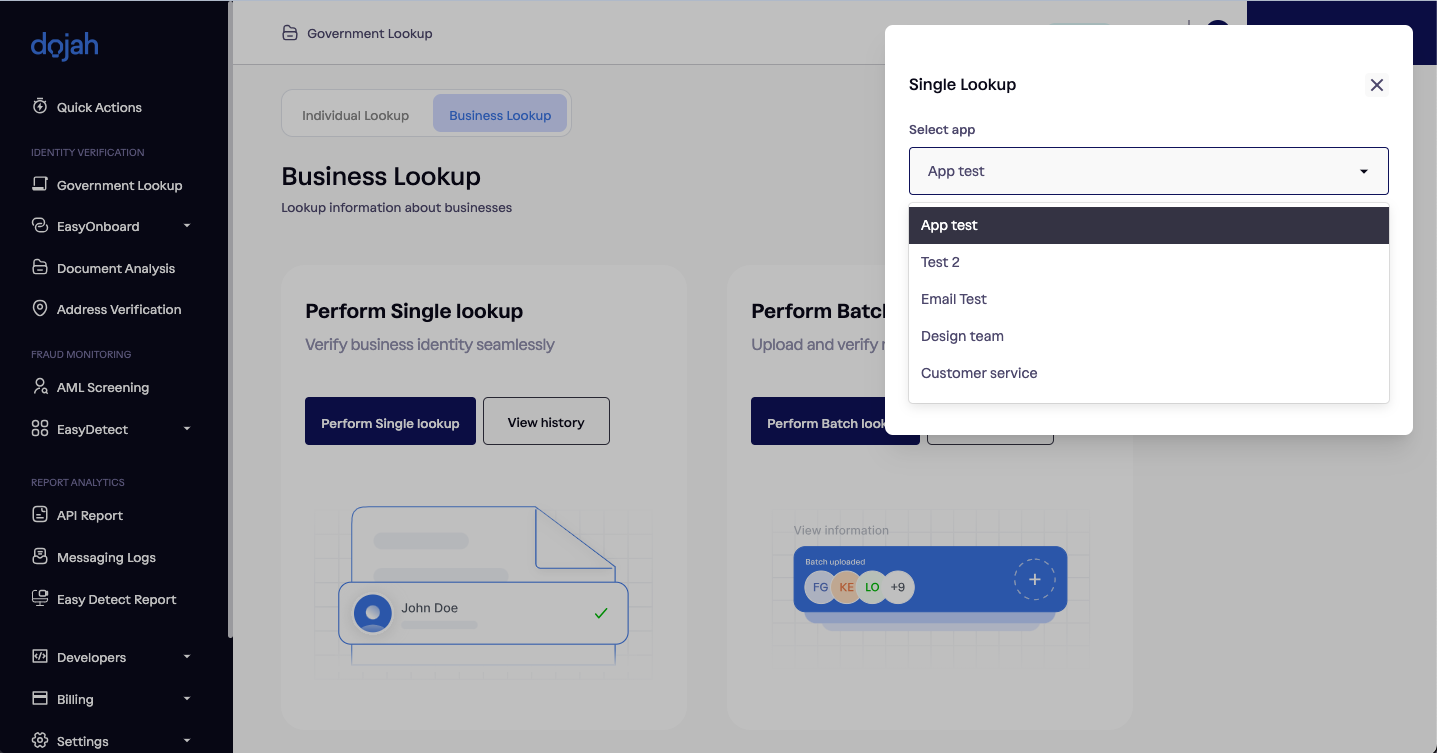 <figure><img src="https://3296995301-files.gitbook.io/~/files/v0/b/gitbook-x-prod.appspot.com/o/spaces%2F2pgHlRJB7EejHn55UcwX%2Fuploads%2F01D2F8TniRCr1gzMT7Pf%2FScreenshot%202024-06-03%20at%2009.48.09.png?alt=media&#x26;token=240b98b3-4d66-4d6d-b62c-12622b560fd4" alt=""><figcaption><p>Side modal for performing a single lookup</p></figcaption></figure>