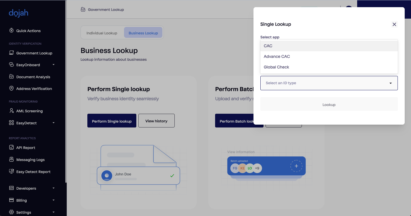 1\) Customers can initiate a Business Batch Lookup by clicking on the <mark style="color:blue;">"Perform Batch Lookup"</mark> button, prompting the **side modal** to appear, as illustrated in the image below;